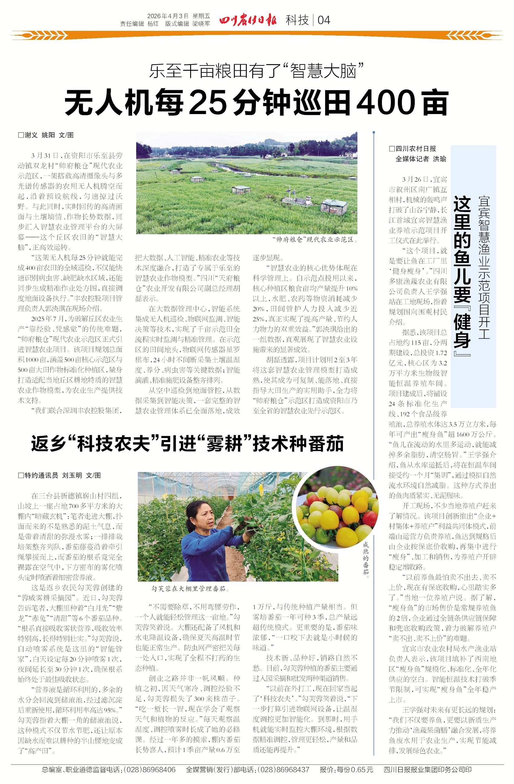 智慧农业点亮四川乡村,种田更高效、更智能。乐至千亩粮田装上“智慧大脑”,无人机25分钟巡田400亩;三台返乡“科技农夫”引进“雾耕”技术种番茄,实现山坡地无土栽培与节水增产;宜宾智慧渔业示范项目开工,打造工厂化循环水养殖新模式,推动水产养殖智能化升级。