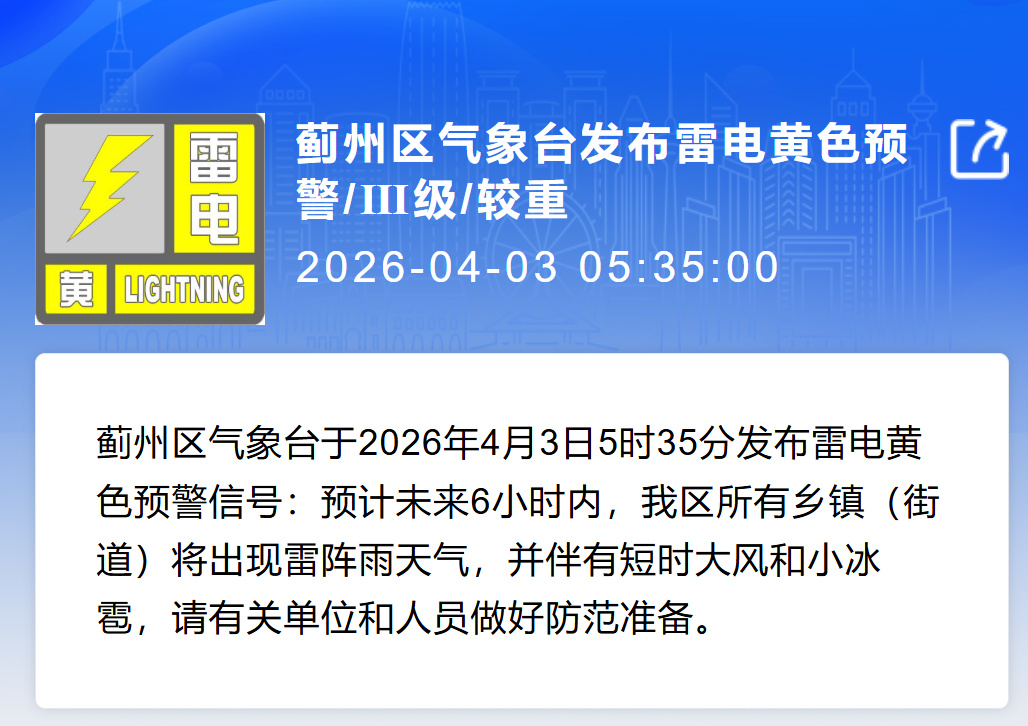 蓟州区气象台于2026年4月3日5时35分发布雷电黄色预警信号:预计未来6小时内,我区所有乡镇(街道)将出现雷阵雨天气,并伴有短时大风和小冰雹,请有关单位和人员做好防范准备。