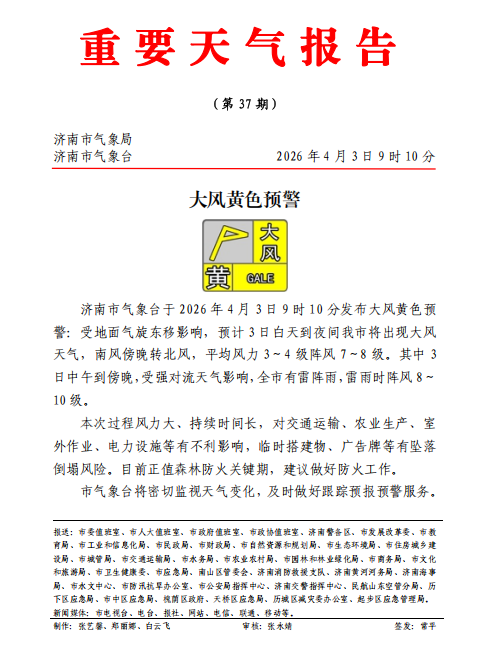济南市气象台4月3日9时40分发布大风黄色预警信号:
