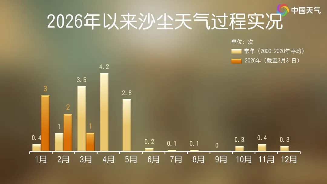 从中国天气网统计数据来看,春季(3至5月)本就是北方沙尘天气最频繁时段,沙尘过程占全年八成左右,而4月是全年沙尘最多的月份。今年以来,北方已出现6次沙尘过程,较常年同期略偏多,此次过程将是4月北方首轮较大范围沙尘过程。