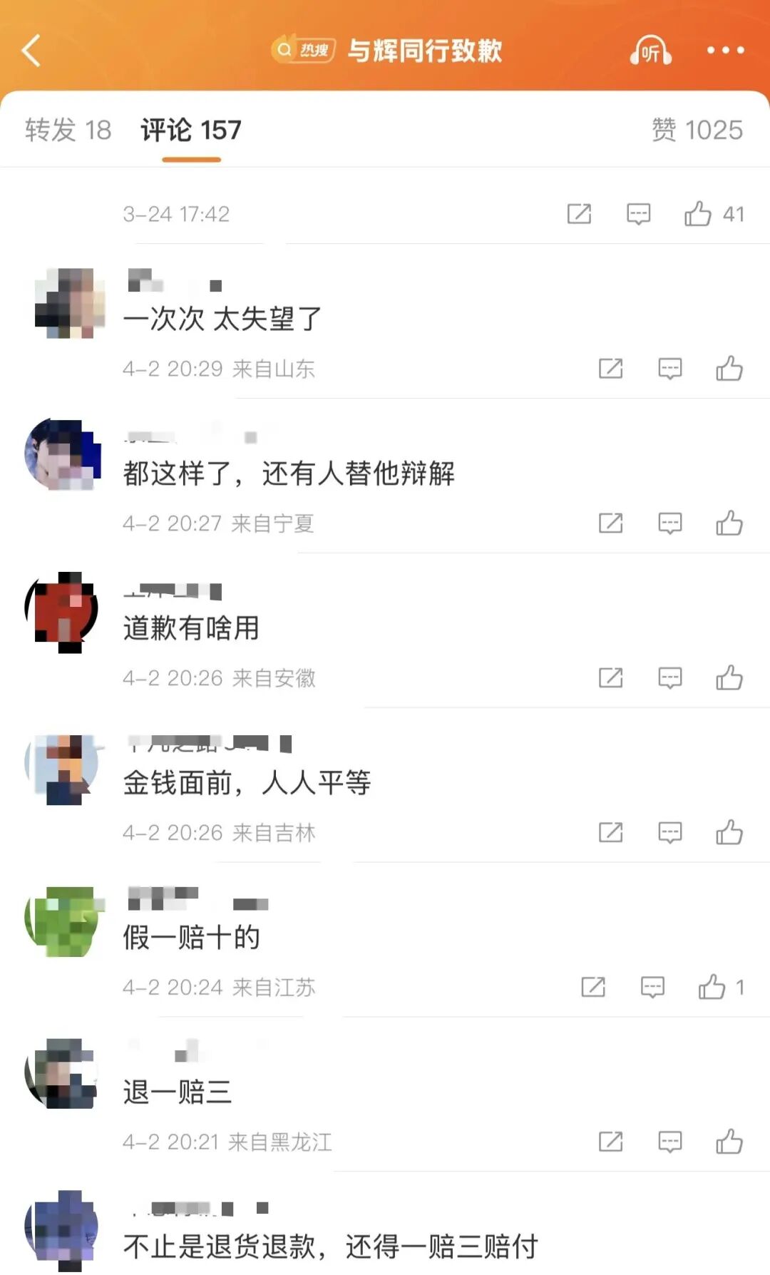 对于与辉同行的回应,网友表示“说好了单独生产线的”“退一赔三,而不是退款就完事了”“一次次 太失望了”。