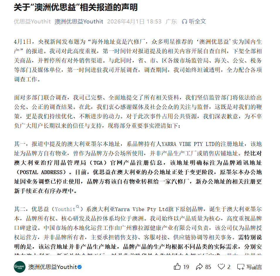 4月1日,央视曝光霸占电商平台销量榜首、多位明星推荐的网红保健品“澳洲优思益”号称澳洲原装进口,实为国内生产,其海外注册地竟是一家汽车维修站。