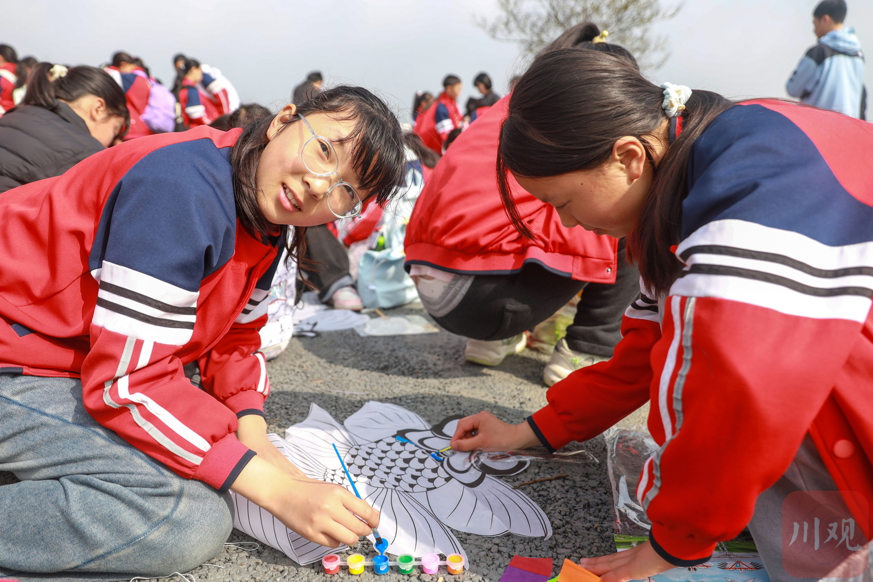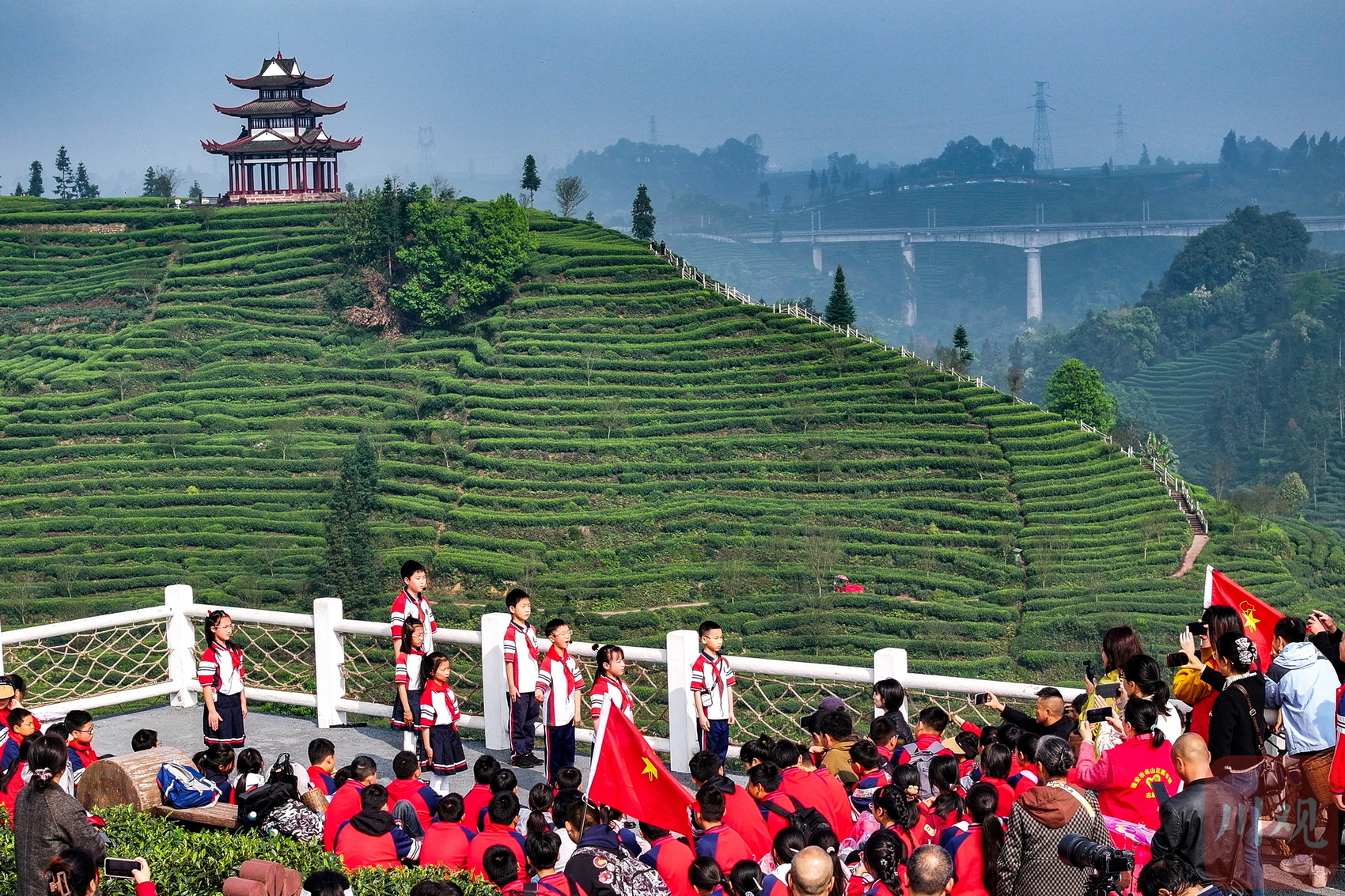 由于四川中小学分时段放春假,在骑龙村“千里江山图”打卡点,既有正在放春假的成都小朋友,还有正在进行“春季研学”的雅安学生。当天,100多位雅安市名山区新店镇中心小学的孩子们来到骑龙村观景平台,朗诵诗词、制作手绘风筝、蒲扇、采茶。当地文化馆的工作人员为他们准备了手工材料、文创周边、杂志等。
