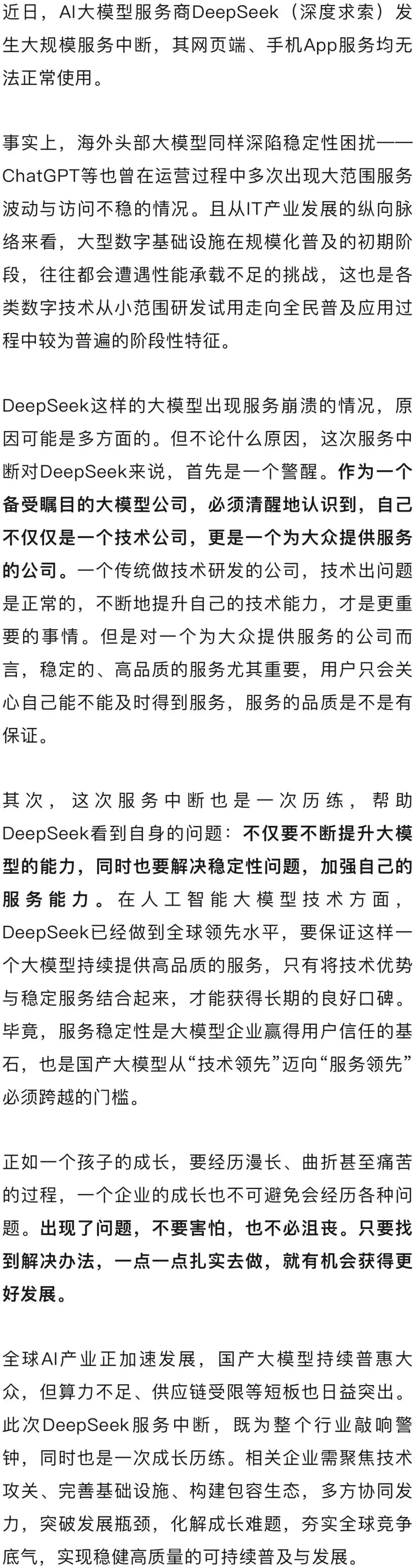 来源|人民网-观点频道 作者:任网平,原标题《人民锐评:这次DeepSeek中断既是警示也是历练》