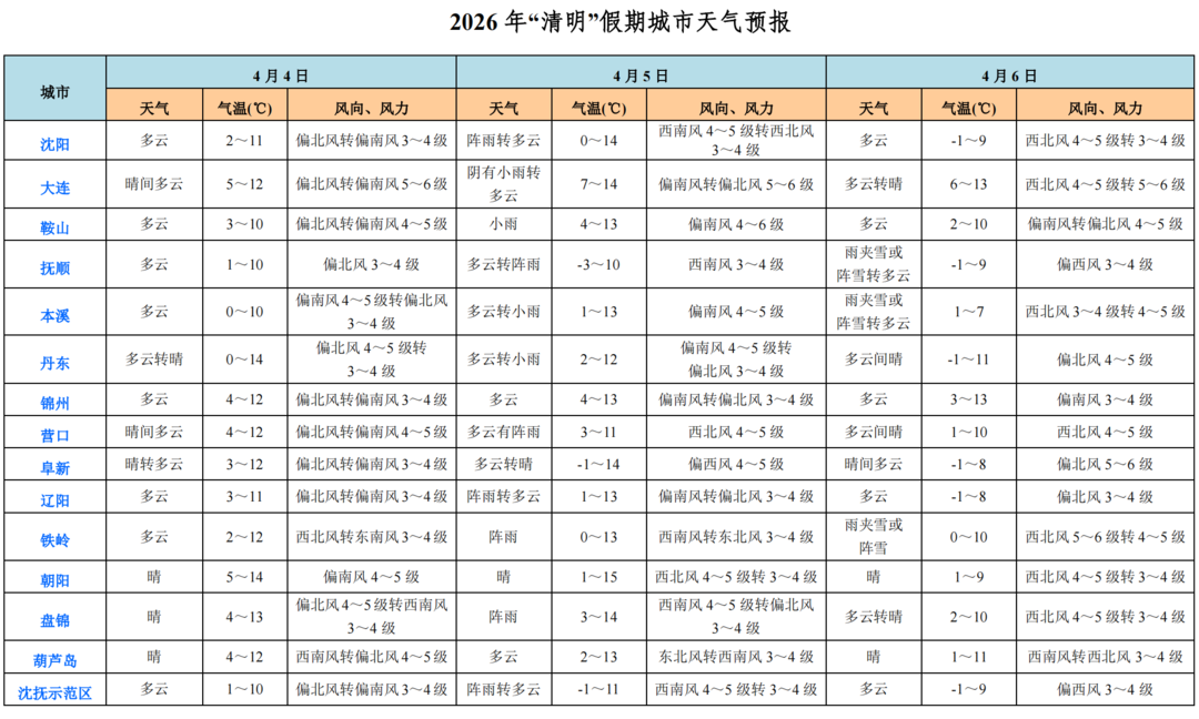 4月3日,辽宁省气象台发布“清明”假期气象信息专报,预计4月4日至4月6日我省先晴后雨,5日中东部地区有小雨(0.1~8毫米),6日夜间东北部地区有雨夹雪或阵雪,其他时段以晴有时多云天气为主;部分时段风力大,海区和陆地最大阵风7~8级。森林火险气象等级较高,4日和6日白天西部、中北部地区可达4级(容易燃烧)。建议加强用火安全管理,关注降水、大风天气对海上航运、交通出行、户外安全等的影响。