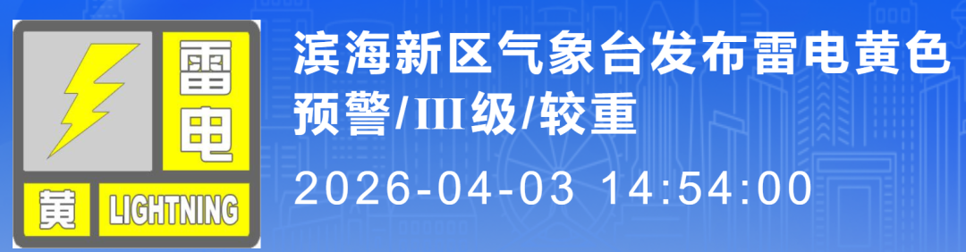 滨海新区气象台于2026年04月03日14时54分发布雷电黄色预警信号:预计未来3小时内,滨海新区所有街镇将有雷阵雨天气,雷雨时伴有短时大风,阵风将达到8-10级,请有关单位和人员做好防范准备。