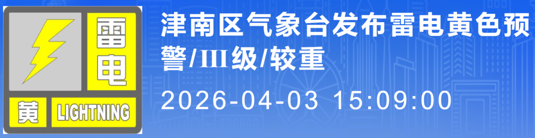 津南区气象台于2026年04月03日15时09分发布雷电黄色预警信号:预计今天下午至傍晚,津南区所有镇街将有雷阵雨天气,雷雨时伴有短时大风,阵风将达到8-10级,请有关单位和人员做好防范准备。