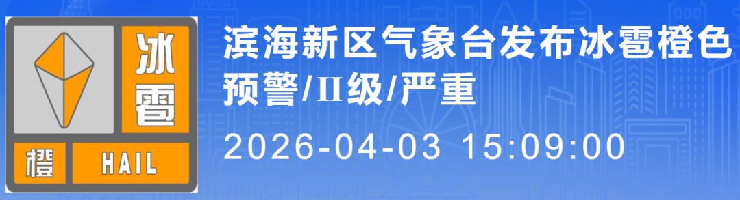 滨海新区气象台于2026年04月03日15时09分发布冰雹橙色预警信号:预计未来3小时内,滨海新区所有街镇将有雷阵雨天气,可能出现冰雹,请有关单位和人员做好防范准备。