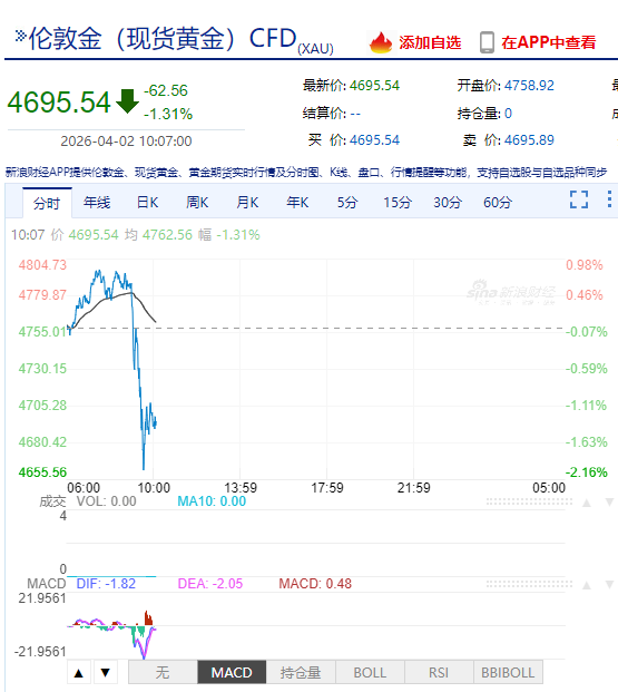 黄金应声跳水,跌破4700美元。截至上午10时07分,现货黄金报4695.54美元/盎司,日内跌幅1.31%。
