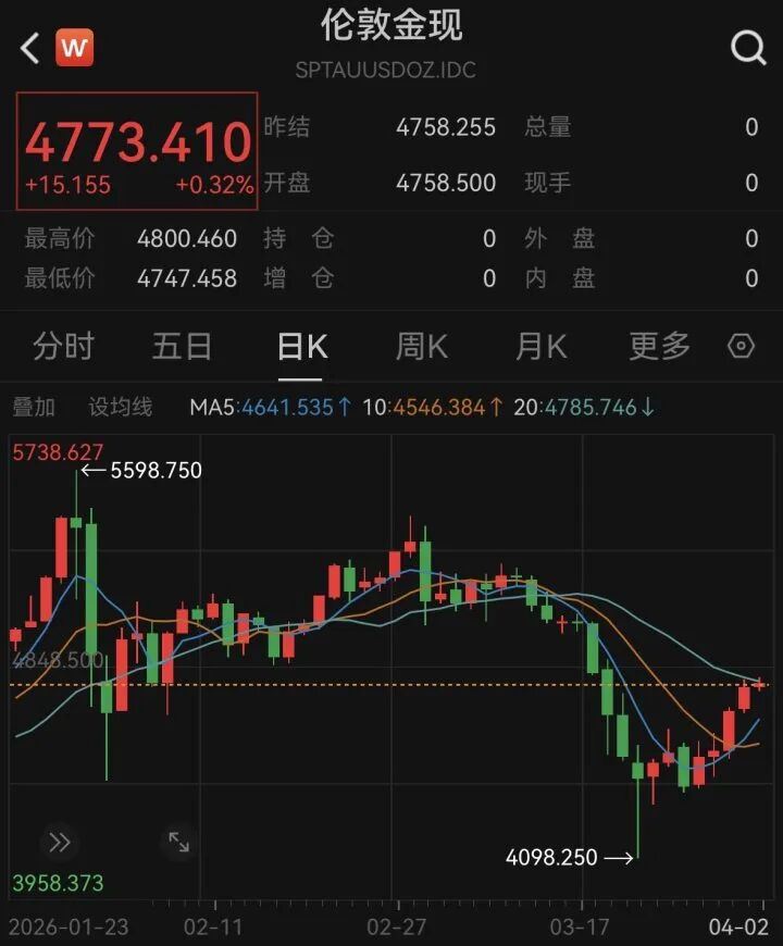 金价持续反弹,北京时间4月2日亚市早盘,现货黄金一度涨破4800美元/盎司,连续第五个交易日上涨。