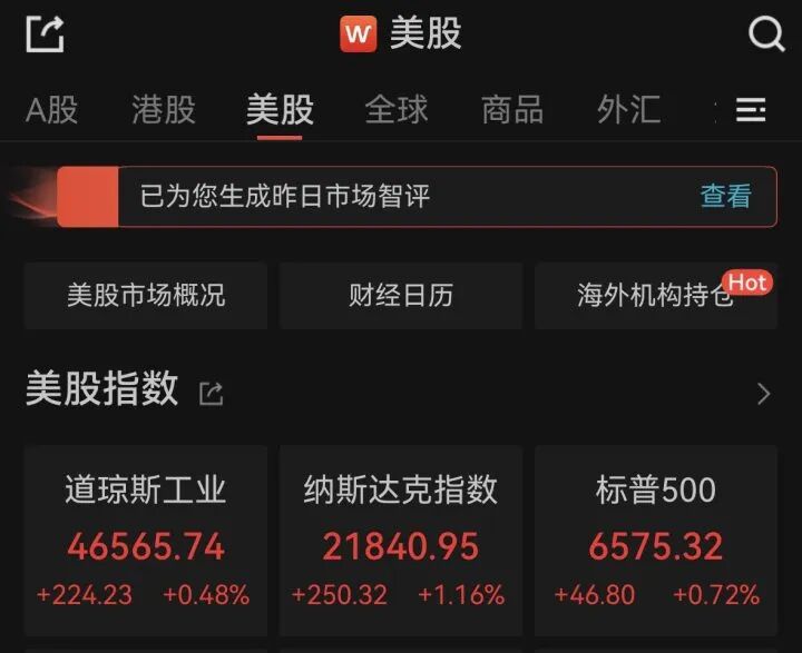 美东时间周三,美股三大指数连续第二个交易日上涨。截至收盘,道指涨0.48%,报46565.74点;纳指涨1.16%,报21840.95点;标普500指数涨0.72%,报6575.32点。