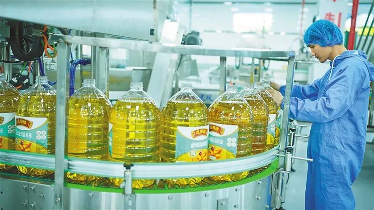 位于洋浦经济开发区保税港区的澳斯卡粮油生产车间内,工人在成品油的流水线上作业。海南日报全媒体记者 张茂 摄