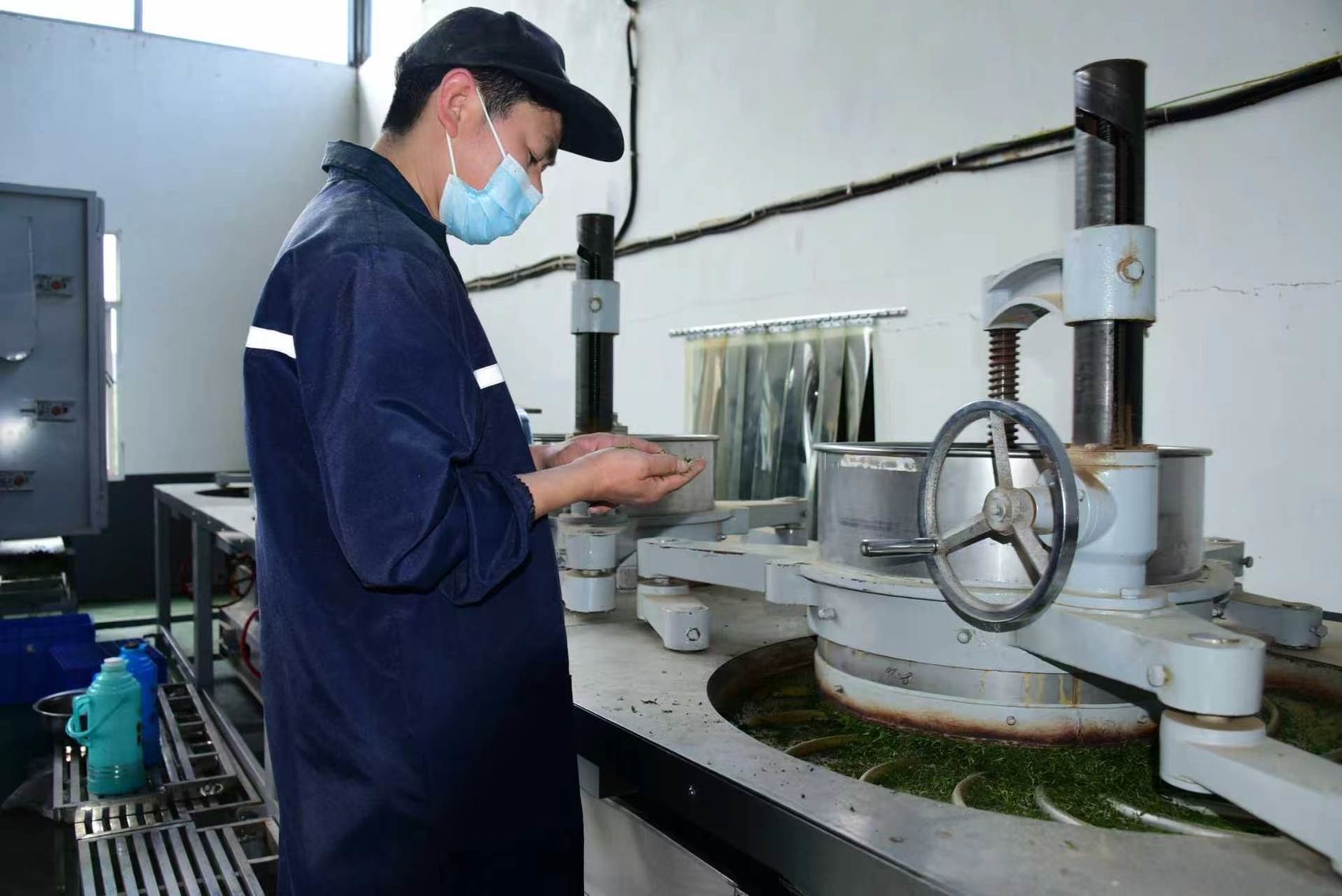 茶叶生产车间,窗明几净,机声嗡鸣。身着工装的制茶工人忙个不停。一片片绿芽在工人师傅手中,翻动滚落,很快进入下道工序。
