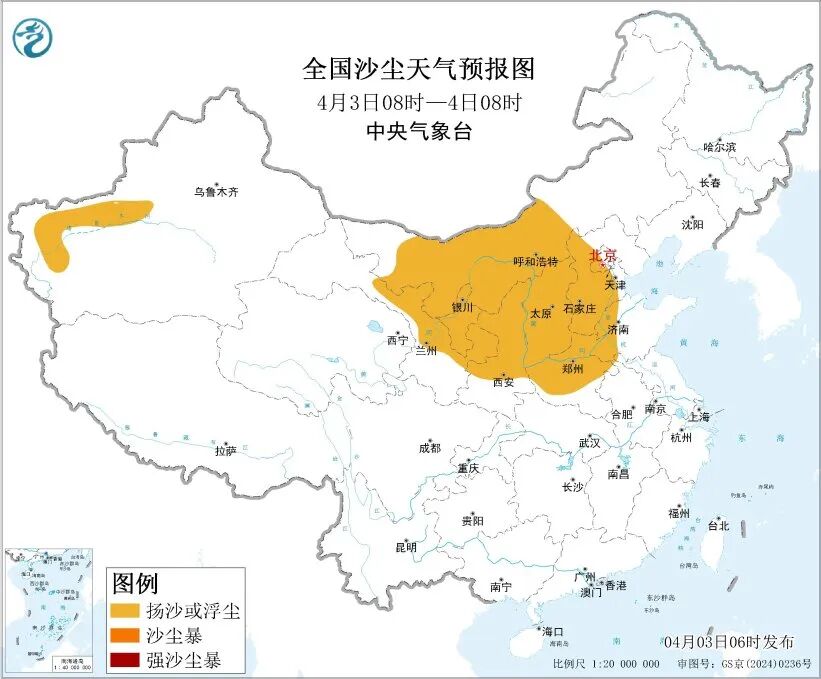 受冷空气大风影响,预计4月3日8时至4日8时,新疆南部、内蒙古中西部、甘肃中东部和河西、宁夏、陕西中北部、山西、北京西南部、天津西部、河北中南部、河南中北部、山东西部等地的部分地区有扬沙或浮尘天气。