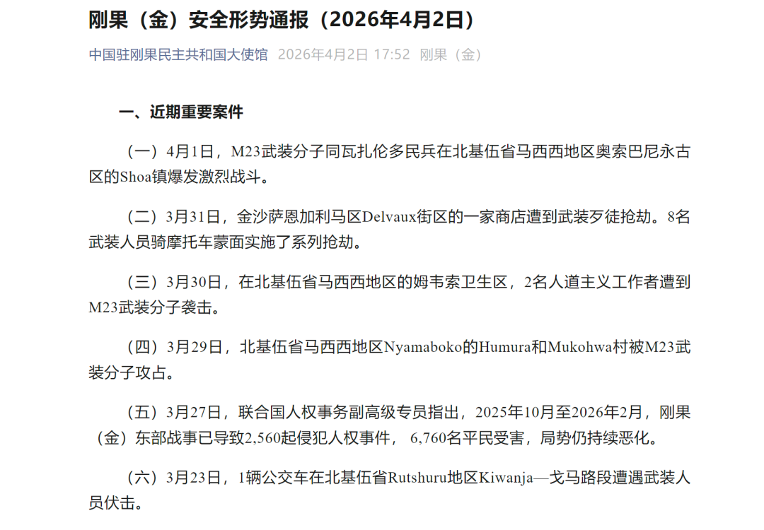 中国驻刚果(金)使馆提醒中国公民务必高度重视安全问题 当前,刚果(金)安全形势复杂严峻。刚东的北基伍省、南基伍省安全形势急剧恶化,刚军和M23持续激烈交火。伊图里省、上韦莱省等地安全形势不容乐观。M23、ADF、CODECO、马伊—马伊民兵、扎伊尔民兵等非法武装在北基伍、南基伍、伊图里、上韦莱等省份持续作乱。暴力冲突和武装抢劫、绑架等事件时有发生。在刚中国公民面临的安全风险依然较高。(详情请戳↓↓↓)