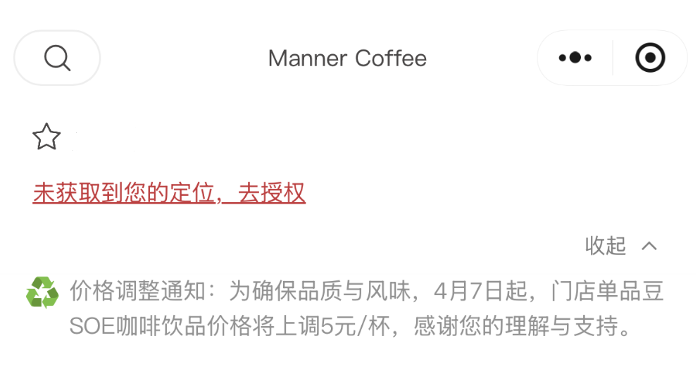 近期,Manner Coffee在其官方点单小程序发布价格调整公告,表示将从4月7日起将门店单品豆SOE咖啡,每杯价格上调5元。此外,其门店热门产品“绿野仙踪”已在4月2日完成焕新升级,价格同样上涨5元。