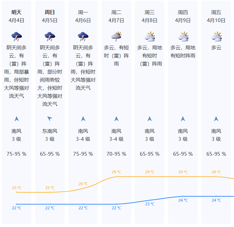 清明节假期我市天气不稳定,发生暴雨和强对流的风险高,其中3日夜间至4日,阴天间多云,有雷阵雨,局部暴雨,伴有8级或以上短时大风等强对流天气,5-6日多雷雨,局地强对流和暴雨风险高;