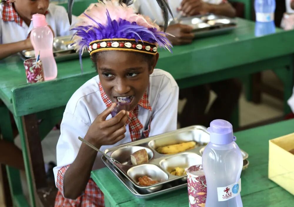 日前,笔者跟随中国驻印度尼西亚大使馆和联合国儿童基金会联合考察评估团,在印尼最东部省份巴布亚省的首府查亚普拉附近一所小学听到了这样的歌声。由中国国家国际发展合作署与儿基会合作支持印尼政府推行的免费营养餐计划,正在改善当地儿童和妇女的营养水平。