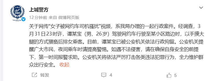 关于网传“女子被网约车司机骚扰”视频,系我局办理的一起行政案件。经调查,3月31日23时许,谭某宝(男,26岁)驾驶网约车行驶至某小区路边时,以手摸大腿的方式猥亵后排女乘客。目前,谭某宝已被公安机关依法行政拘留。