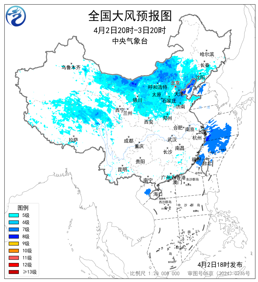 2日20时至3日20时,受蒙古气旋影响,内蒙古中西部、甘肃西部、宁夏、陕西中北部、山西大部、河北、北京、天津、河南北部、山东北部、辽宁大部等地部分地区有5~7级大风,阵风8~10级。受冷空气和对流共同作用影响,河北东部、天津、辽宁西部、山东北部、广西东部、广东北部等地局地有10~11级雷暴大风。
