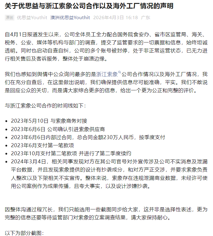 今天(4月3日)下午,优思益发布关于与浙江索象公司合作以及海外工厂情况的声明。