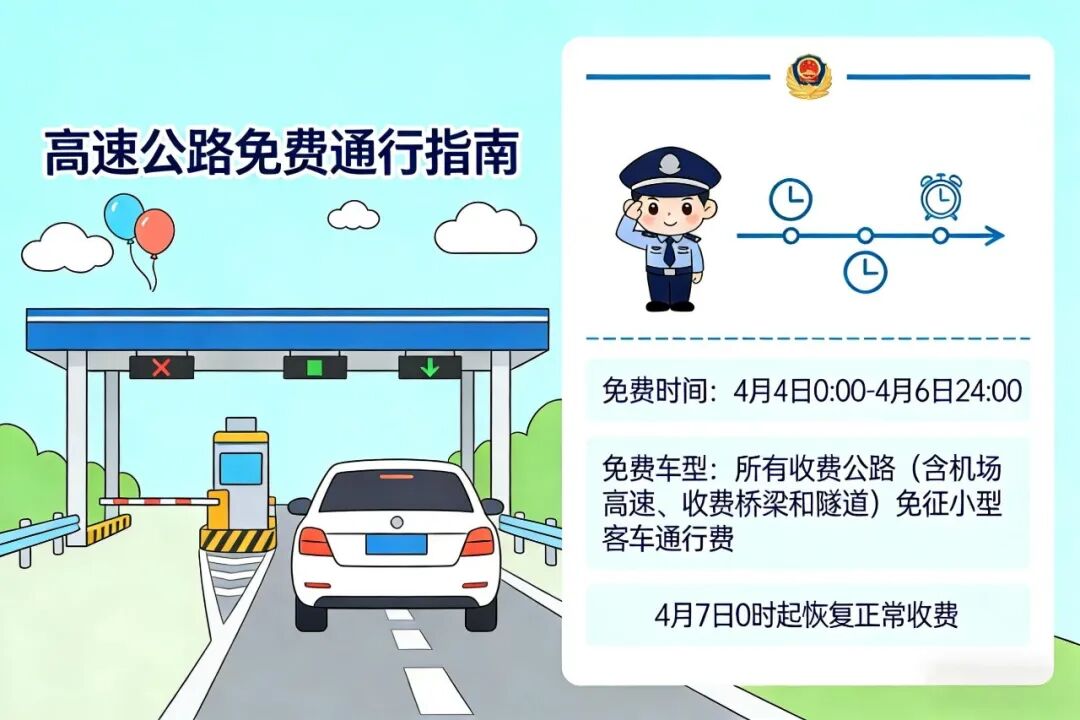2026年清明假期为4月4日至4月6日,假期期间天气以晴到多云为主,具体气温为4日11~22℃、5日10~28℃、6日9~25℃,伴有偏南风转偏北风,阵风可达4~7级,整体适宜出行,加之高速公路对七座及以下小型客车实行免费通行(免费时间4月4日0时至4月6日24时),预计假期出行流量将大幅攀升。