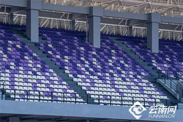 体育场内部,紫色与白色交织的座椅构成了主色调,形成富有韵律的视觉图案。而在体育场北通道两侧,32株蓝花楹已全部种植到位,待到花期,场内场外紫色呼应,将呈现出“馆在花中、花映场馆”的独特景致。这一设计既融入了昆明的城市文化符号,也让这座老场馆在功能升级的同时,拥有了更具识别度的造型。