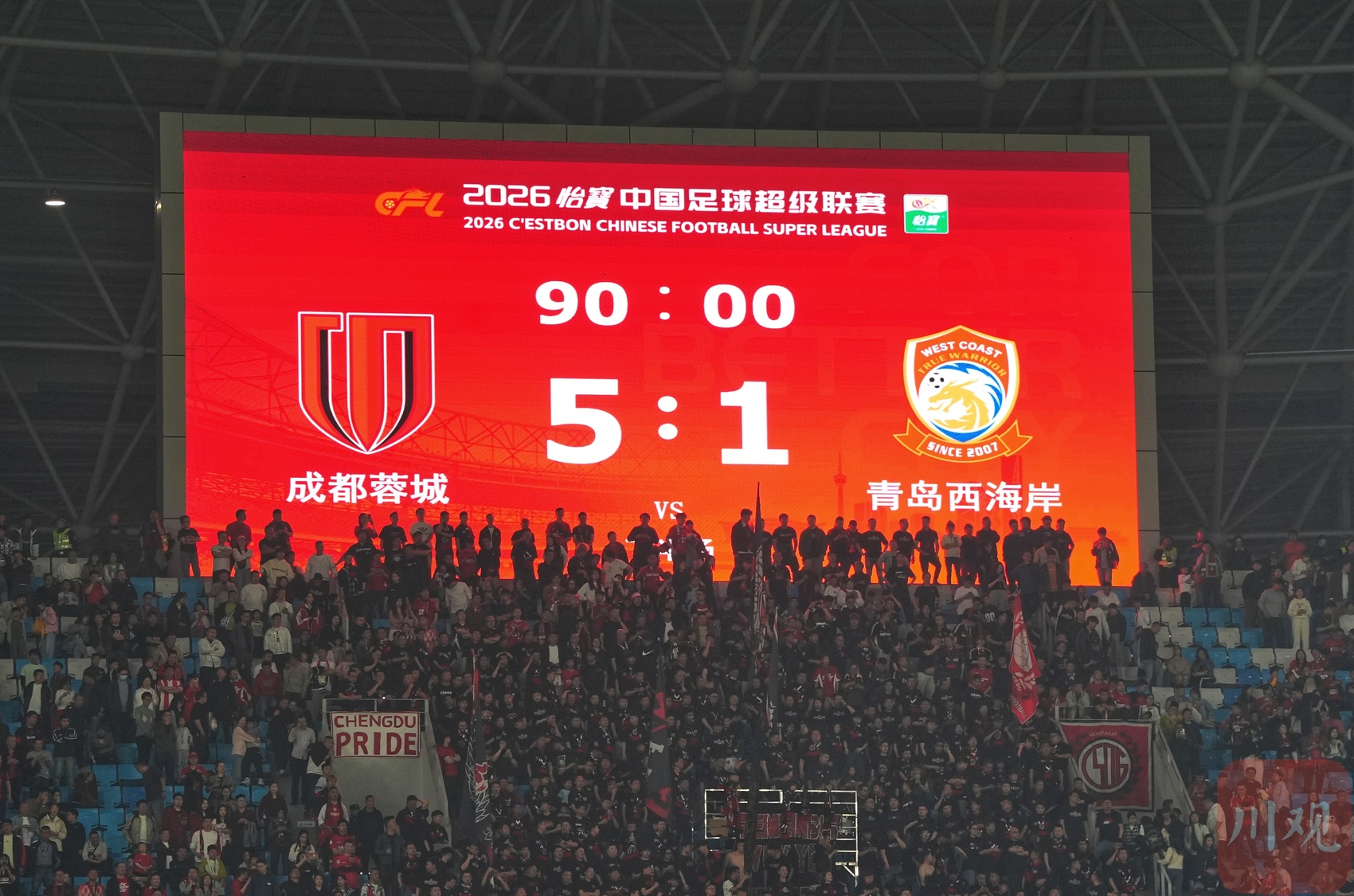 4月3日晚,2026赛季中超联赛第4轮在成都打响。在成都蓉城主场超过4万名球迷的助威声中,主队以5比1大胜青岛西海岸,继续领跑积分榜。