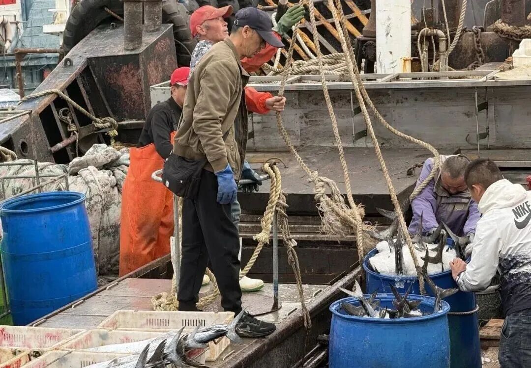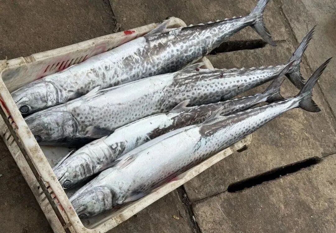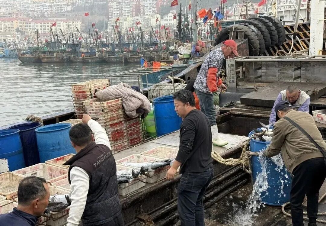 6时许,一艘载着新鲜春鲅鱼的渔船缓缓靠岸。等候已久的商贩们早已将冷藏车、货车沿堤岸排开,翘首以盼。随着船老大一声“上鱼喽!”,船舱缓缓开启,蓝色圆桶中,一条条鲅鱼跃入眼帘——脊背蓝黑透亮,点缀着蓝光斑点,腹部莹白,鱼鳃鲜红,挺拔不打弯,带着本地春汛鲅鱼特有的鲜活肥美。