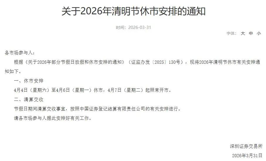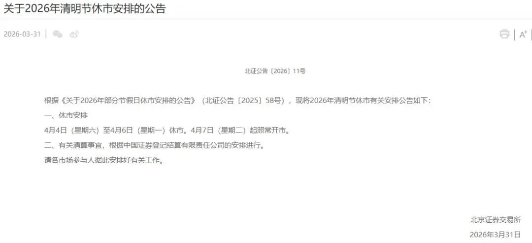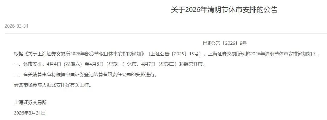 3月31日,上交所、深交所、北交所公布2026年清明节休市安排: