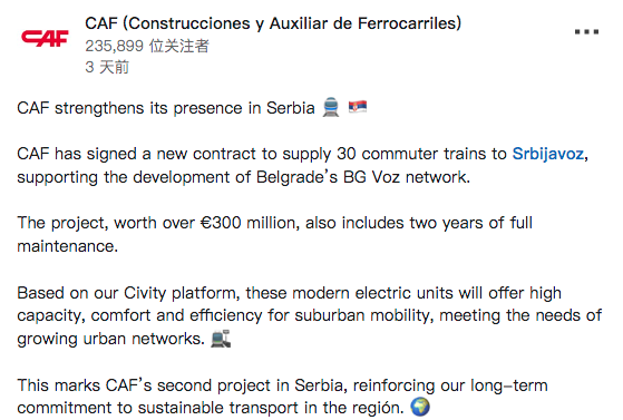西班牙CAF在塞尔维亚的第二个轨道交通车辆项目