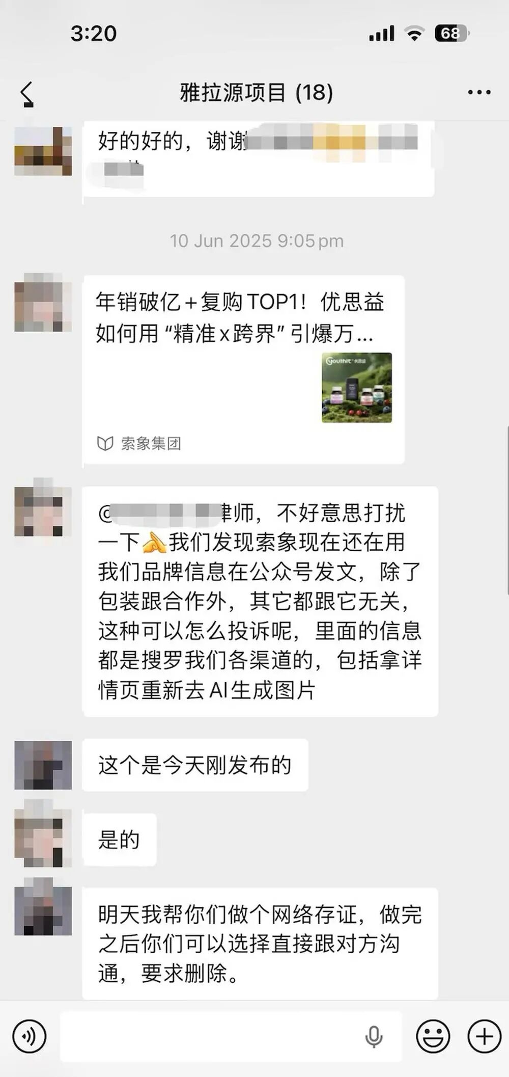 优思益表示,2025年6月10日,发现“索象集团”公号伪造相关案例,作为典型案例传播,已请律师取证,做好起诉准备。