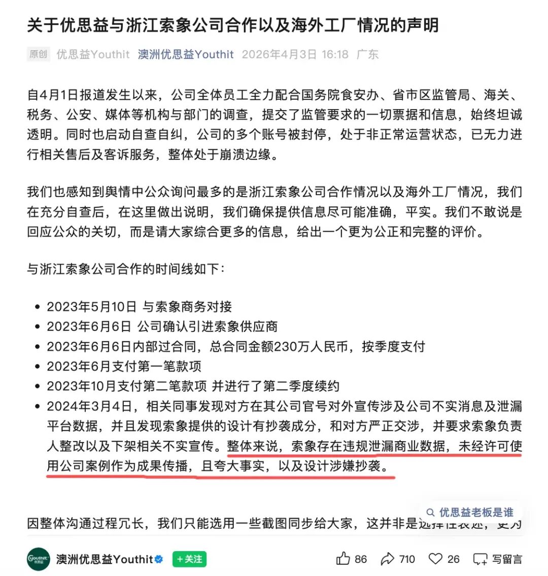 4月3日,“澳洲优思益Youthit”微信公众号发布关于优思益与浙江索象公司合作以及海外工厂情况的声明: