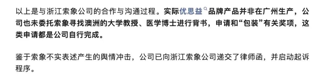 优思益在声明中表示,实际优思益品牌产品并非在广州生产,公司也未委托索象寻找澳洲的大学教授、医学博士进行背书,申请和“包装”有关奖项,这类申请都是公司自行完成。