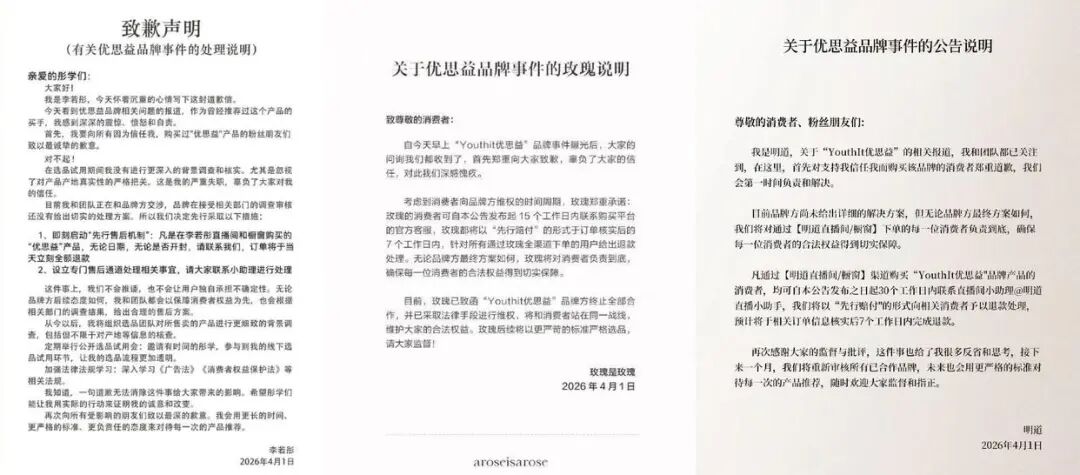 事件曝光后,李若彤、章小蕙、明道等多位曾代言或售卖过“优思益”产品的艺人致歉,并公布后续处理说明,承诺对直播间购买的产品全额退款。