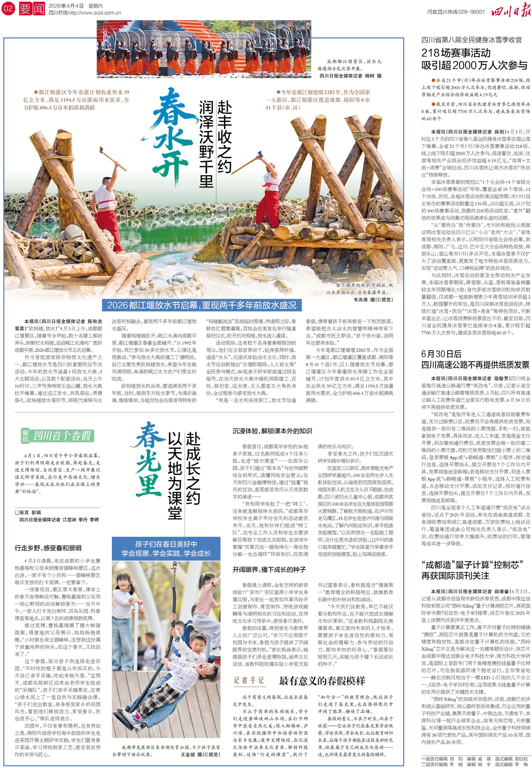 4月3日,2026都江堰放水节正式启幕,堰工挥斧砍断杩槎,引岷江水灌溉成都平原,标志着都江堰灌区春灌全面铺开。本届放水节通过巡江告水、肃穆祭礼等环节重现千年古礼,寄托了风调雨顺的美好愿景。今年是都江堰建堰2282年,灌区计划年度供水83.9亿立方米,满足农业灌溉需求。关注二版,感受放水盛况。