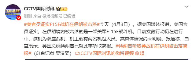 此前一美国官员称,该战机在伊朗境内坠毁后,美方迅速启动搜救任务,试图定位机组人员下落,但其生死状况仍不明确。
