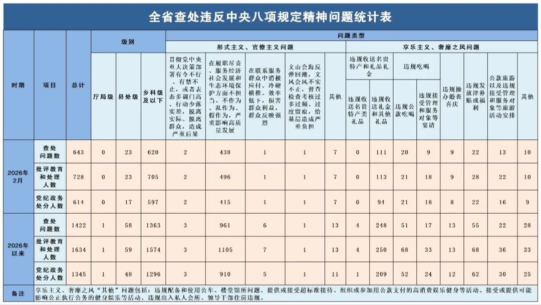为持续传导压力、释放越往后执纪越严的信号,省纪委监委现通报2026年2月全省查处违反中央八项规定精神问题情况。当月,全省共查处违反中央八项规定精神问题643起,批评教育和处理728人,其中给予党纪政务处分614人。具体数据如下图: