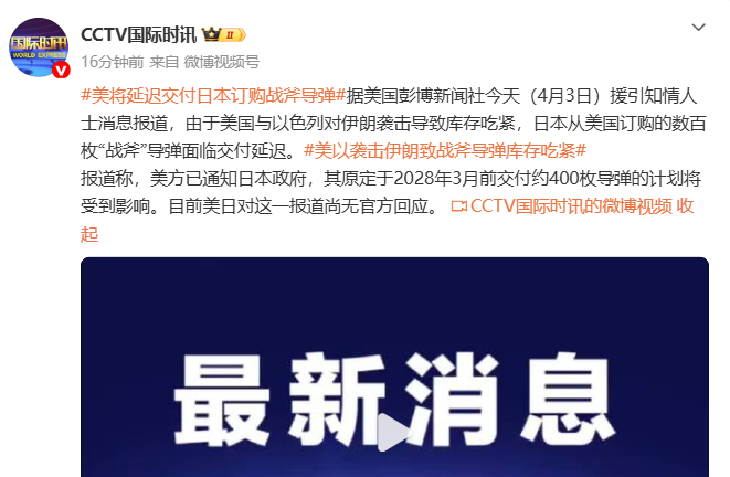 报道称,美方已通知日本政府,其原定于2028年3月前交付约400枚导弹的计划将受到影响。目前美日对这一报道尚无官方回应。