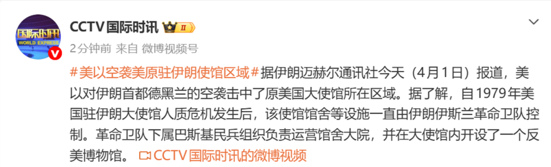 据伊朗迈赫尔通讯社今天(4月1日)报道,美以对伊朗首都德黑兰的空袭击中了原美国大使馆所在区域。