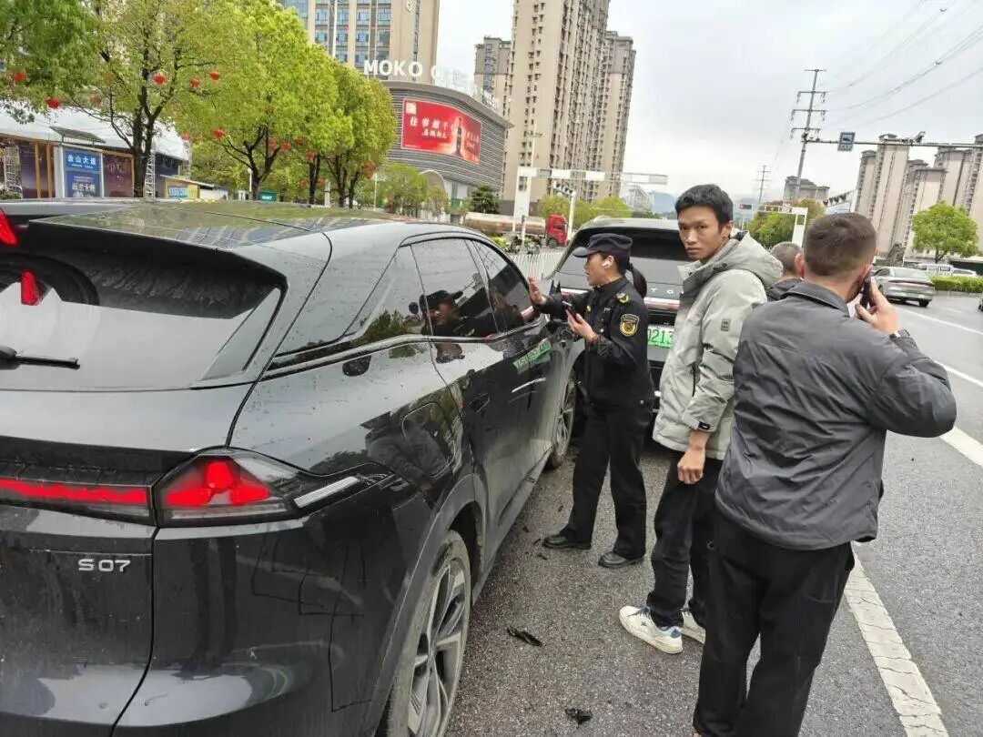 上午9时50分,恩施市金子坝街道金山大道星汇广场路口,两辆左转小车发生碰撞。正在附近巡查的金子坝街道综合执法中心工作人员华友财和姜志威听到异响后,奔向事发地点。