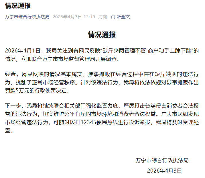 2026年4月1日,我局关注到有网民反映“缺斤少两管理不管 商户动手上蹿下跳”的情况,立即联合万宁市市场监督管理局开展调查。