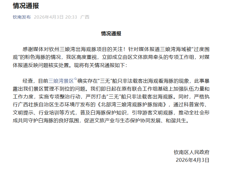 感谢媒体对钦州三娘湾出海观豚项目的关注!针对媒体报道三娘湾海域被“过度围观”的粉色海豚的情况,我区高度重视,立即成立由区文体旅局牵头的专项工作组,对媒体报道反映问题核实处置。现将有关情况通报如下:
