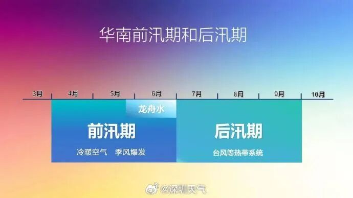 一般来讲,在华南地区,4月至6月为第一个多雨季节,7月至9月为第二个多雨季节。这两个雨季带来的大量降水会导致河水的显著上涨,因此叫做汛期。两个多雨季节时间一前一后,就有了“前汛期”和“后汛期”。
