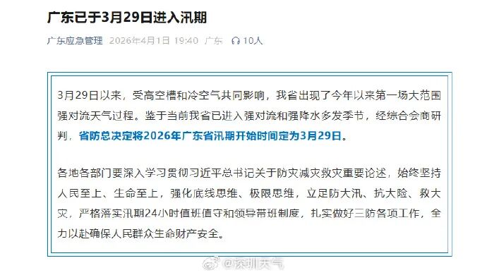 目前广东已进入强对流和强降水多发季节,临近清明假期,需防范暴雨、强对流天气及其造成的衍生次生灾害。