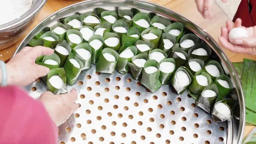 官塘村坐落于珠海唐家湾畔,依山傍海,文脉悠长。走进村中古老的祠堂,暖意融融,笑语盈盈。灶台上大铁锅水汽氤氲,白雾缭绕;村民们围坐成圈,揉粉、擀皮、填馅、包裹,一个个翠绿的艾饼、玲珑的叶仔便整齐码放在粽叶上。蒸汽氤氲中,茶果渐渐变得透亮软糯,诱人的香气在古祠堂里久久不散。