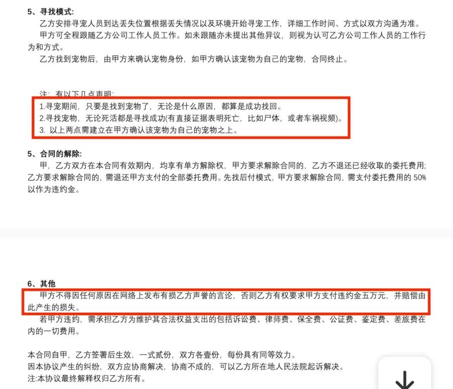 除了服务与价格不对等之外,许多寻宠团队不合理的合同条款也常常引发消费纠纷。