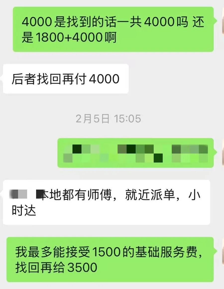 前不久,大学生豆豆(化名)就体验了一次寻宠服务。家里养了一年多的小狗于今年2月在外面走失,寻宠心切的她联系到了一家寻宠团队。对方建议豆豆不要盲目自行寻找,并称拥有热成像仪等专业设备,还展示了多个成功案例。刚开始对方提出5800元的报价,经协商,双方最终达成12个小时共计服务费5000元的协议,包含1500元基础外勤费用,以及寻获宠物后需另行支付的3500元后续费用。
