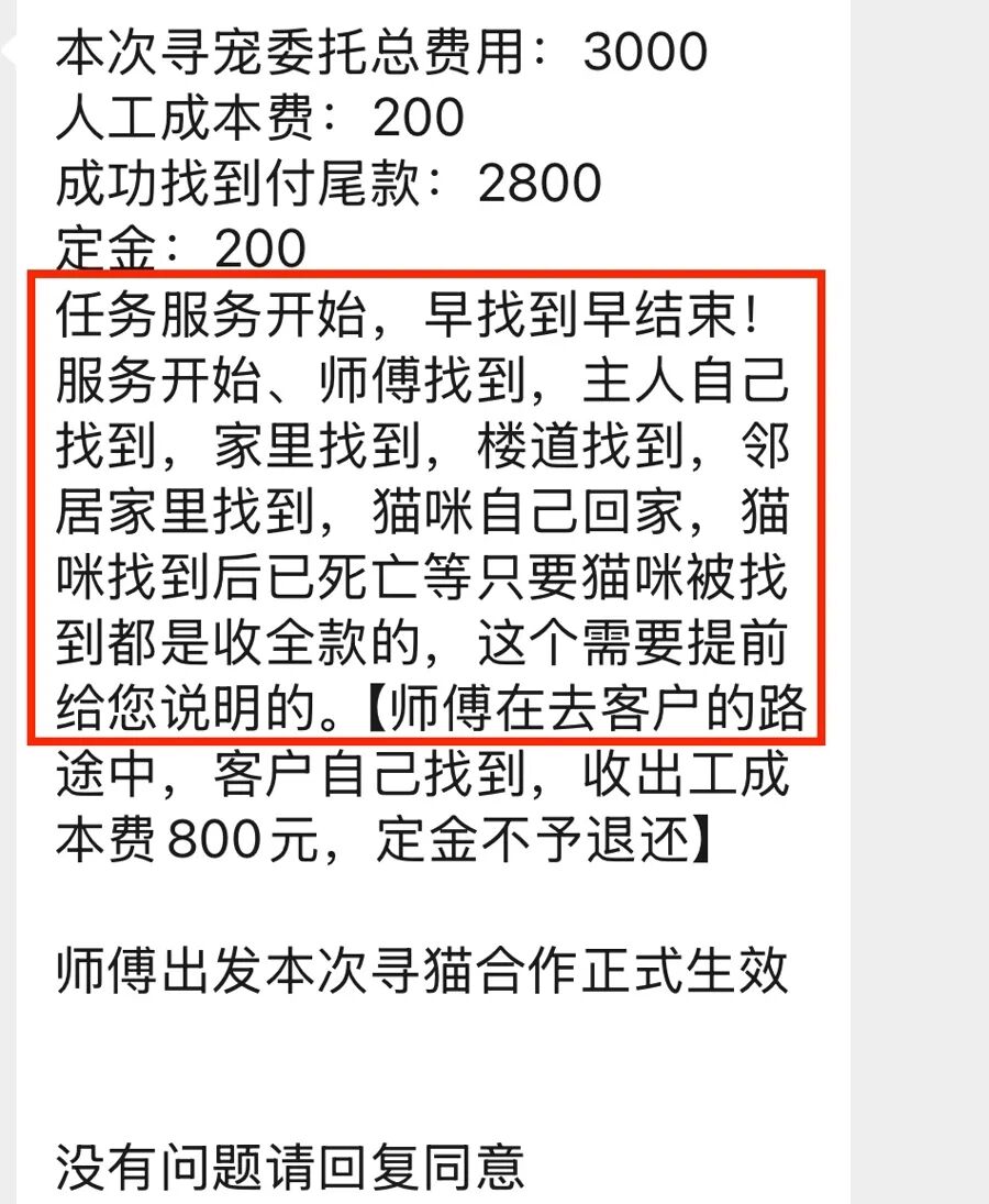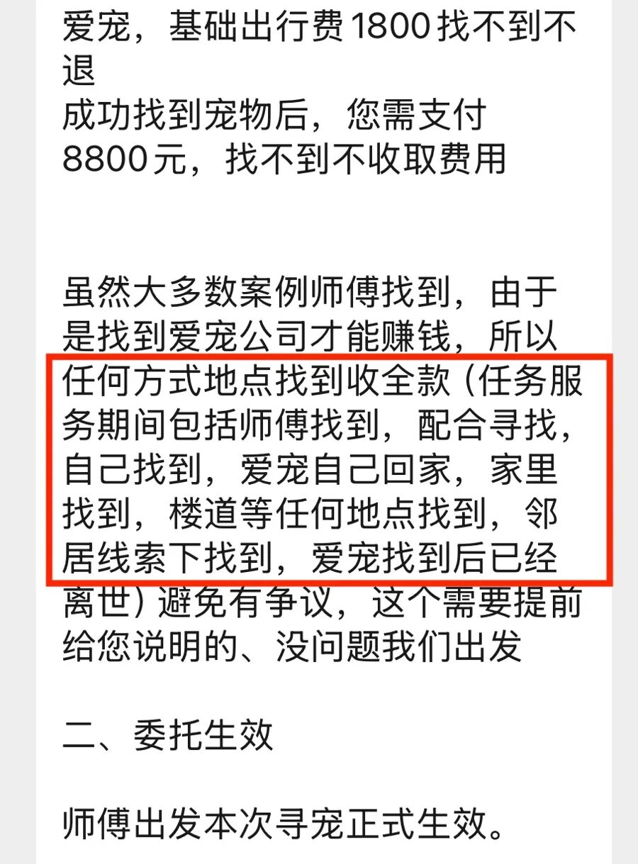 记者发现,许多寻宠团队都在合同中特意标明“找回收费”,将其定义涵盖几乎所有可能的结果:无论宠物是由团队找到、配合找回、主人自行找到、自己回家、师傅前往途中被找到、在任何地点被发现,还是找到时已离世,均视为“已找回”,失主需支付全款。若寻宠团队未能按照约定尽力搜寻、投入人力物力,宠物找回结果与其服务并无直接关联,那么此类条款无疑构成对失主不利的约束。
