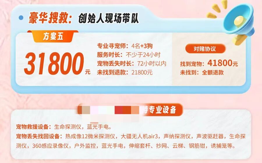 为进一步了解情况,记者假扮失宠人士,随机调查了10个寻宠团队。面对记者给出相同的丢宠状况,10个寻宠团队的报价从3000元到5500元不等,有一个团队甚至推荐价值31800元的“豪华搜救”方案。然而,当被问及定价标准与依据时,所有团队均以“按照以往定价”作答,回答颇为模糊。